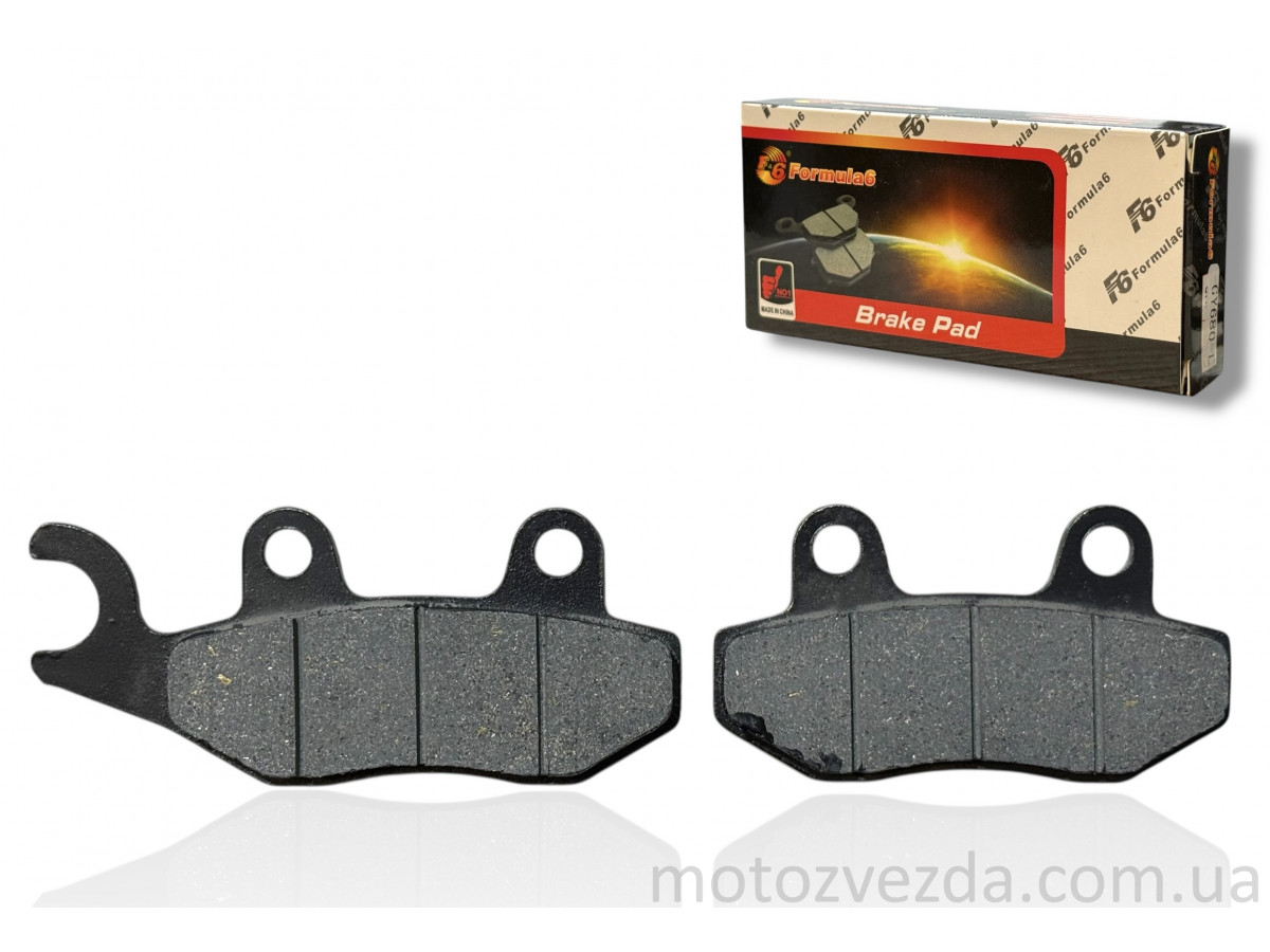 Тормозные колодки(диск) GY6 "ухо влево"(производительFormula 6, или "F6") — этокомплект дисковых тормозных колодок, предназначенных для гидравлических двухпоршневых суппортов китайских четырехтактных скутеров с двигателямиGY6 объемом от 50 до 150 куб. см.