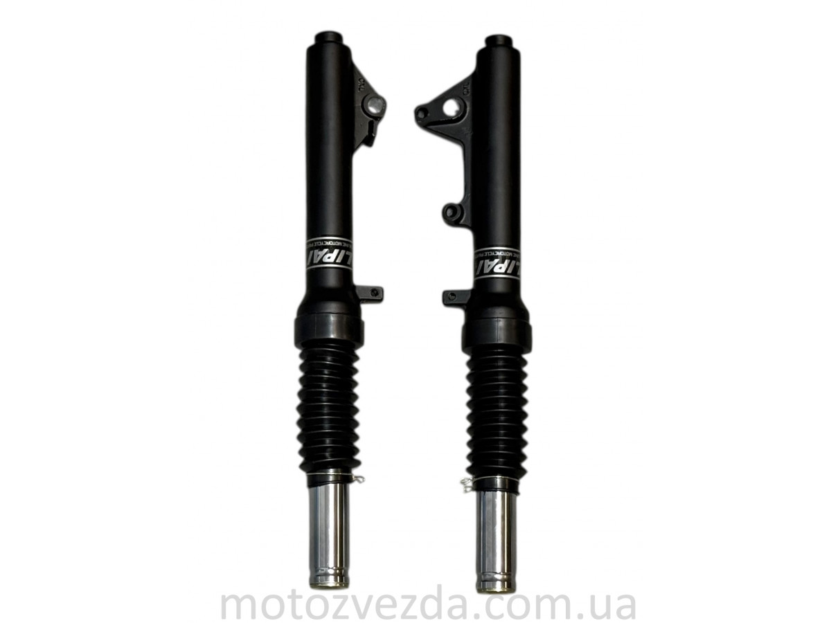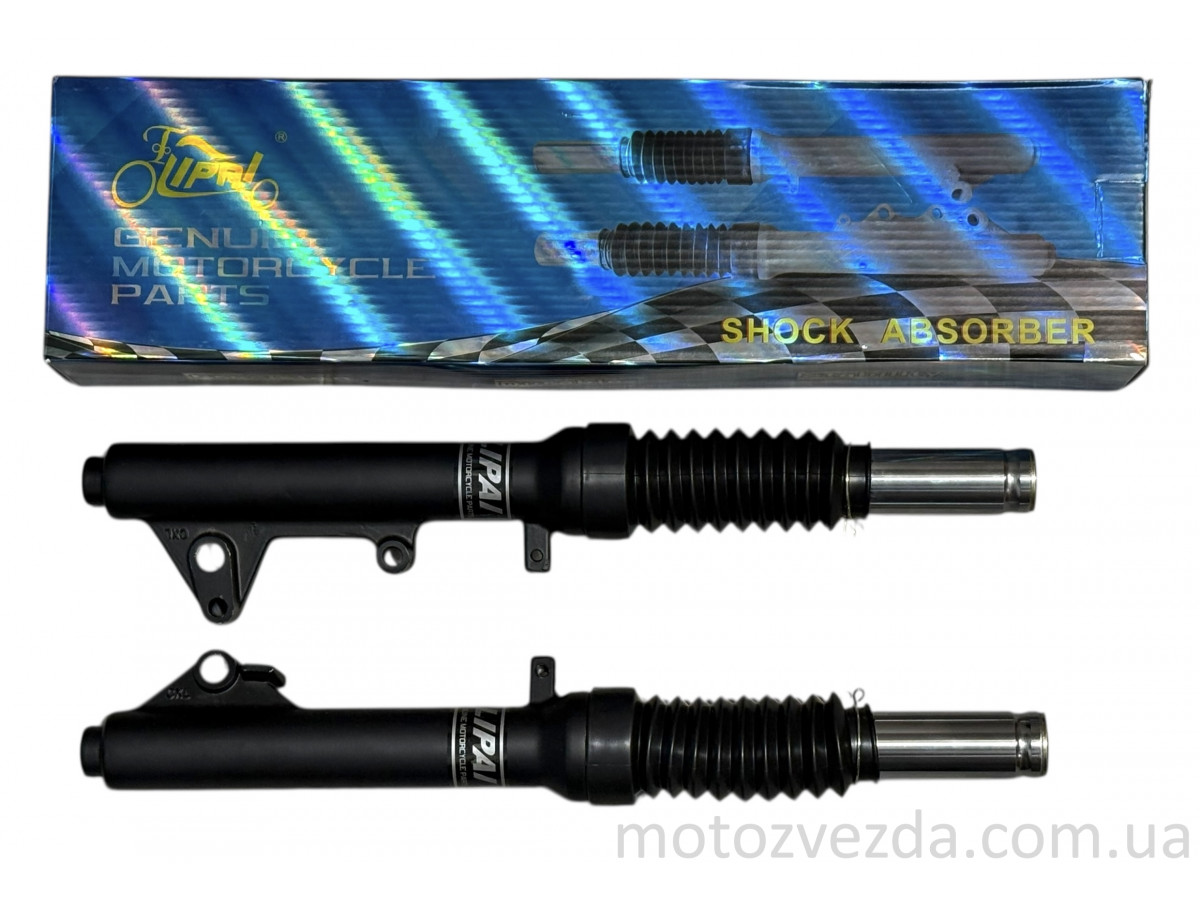 Передние амортизаторы (перья) F50 длиной 390 мм производства "LIPAI" — это гидравлические компоненты подвески, предназначенные для китайских 4-тактных скутеров с двигателями GY6-50/60/80/125/150 куб. см.. Они поставляются в комплекте с защитными резиновыми гофрами.